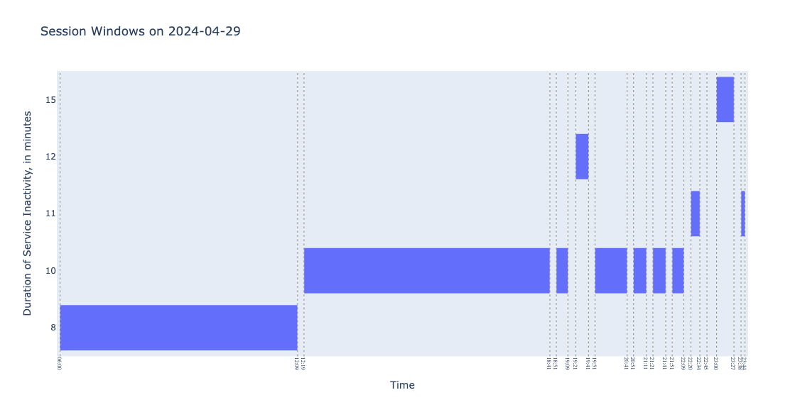 We continue the data analysis by identifying the days in which there were periods of time larger than 10 minutes in which no train was arriving/departing in/from the Amsterdam Centraal Station. In this context, a session window is the period of time in which train services run without a service inactivity gap longer than 10 minutes.